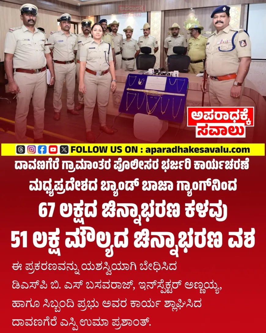 ದಾವಣಗೆರೆ ಗ್ರಾಮಾಂತರ ಪೊಲೀಸರ ಭರ್ಜರಿ ಕಾರ್ಯಚರಣೆ : 51 ಲಕ್ಷ ಮೌಲ್ಯದ ಚಿನ್ನಾಭರಣ ವಶ