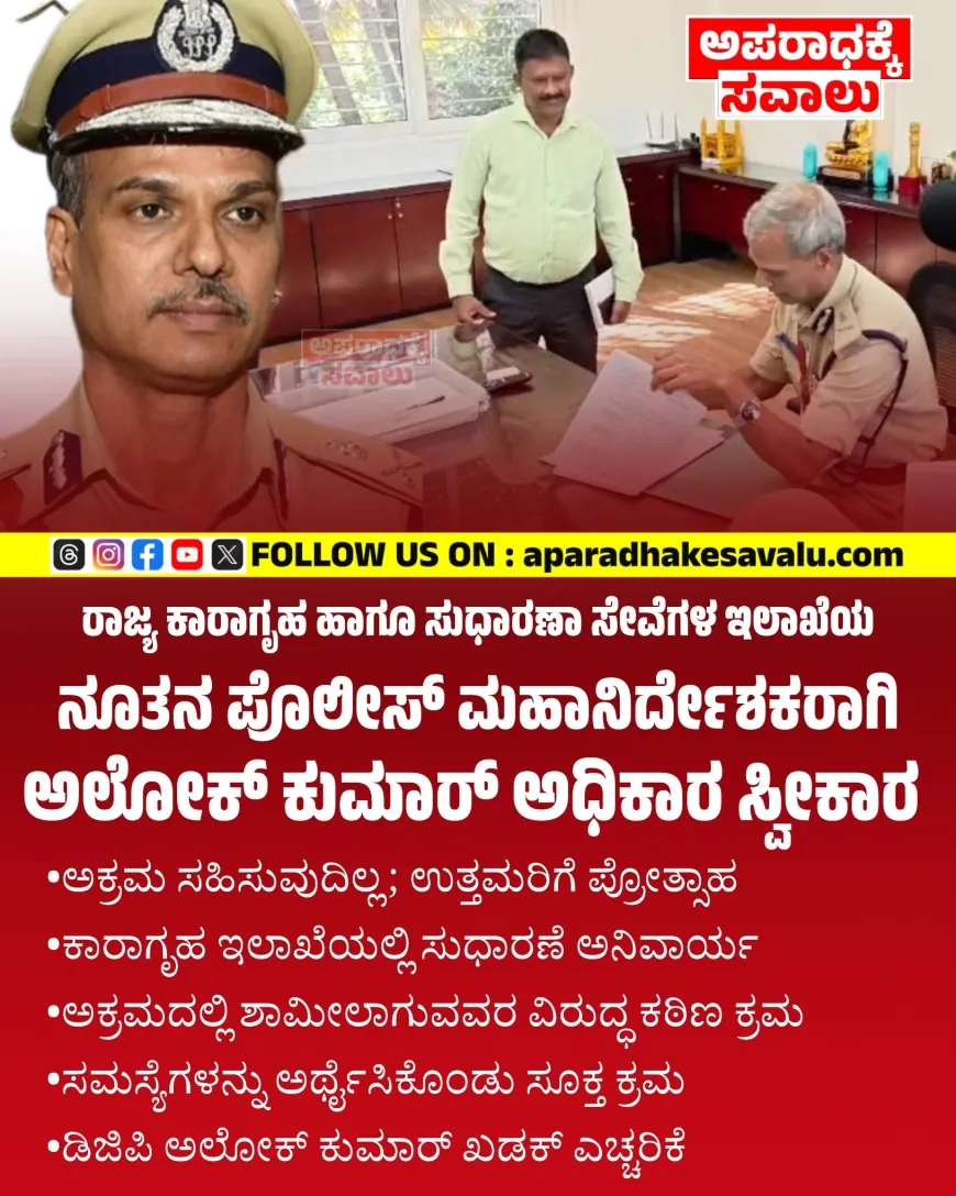 ರಾಜ್ಯದ ನೂತನ ಕಾರಾಗೃಹ ಡಿಜಿಪಿ ಅಲೋಕ್ ಕುಮಾರ್ ಅವರು ಅಧಿಕಾರ ಸ್ವೀಕರಿಸಿದ ತಕ್ಷಣವೇ ಇಲಾಖೆಗೆ ಕಠಿಣ ಸಂದೇಶ ನೀಡಿದ್ದಾರೆ. ಉತ್ತಮವಾಗಿ ಕೆಲಸ ಮಾಡುವ ಅಧಿಕಾರಿಗಳು ಸ್ನೇಹಿತರಂತೆ, ಆದರೆ ಉದ್ದೇಶಪೂರ್ವಕವಾಗಿ ಅಕ್ರಮದಲ್ಲಿ ತೊಡಗುವವರನ್ನು ಕಟ್ಟುನಿಟ್ಟಾಗಿ ಎದುರಿಸುವುದಾಗಿ ಎಚ್ಚರಿಸಿದ್ದಾರೆ. ರಾಜ್ಯದ ಹಲವಾರು ಜೈಲುಗಳಲ್ಲಿ ಸುಧಾರಣೆ ಅಗತ್ಯವಿದೆ ಎಂದು ತಿಳಿಸಿದ್ದಾರೆ.