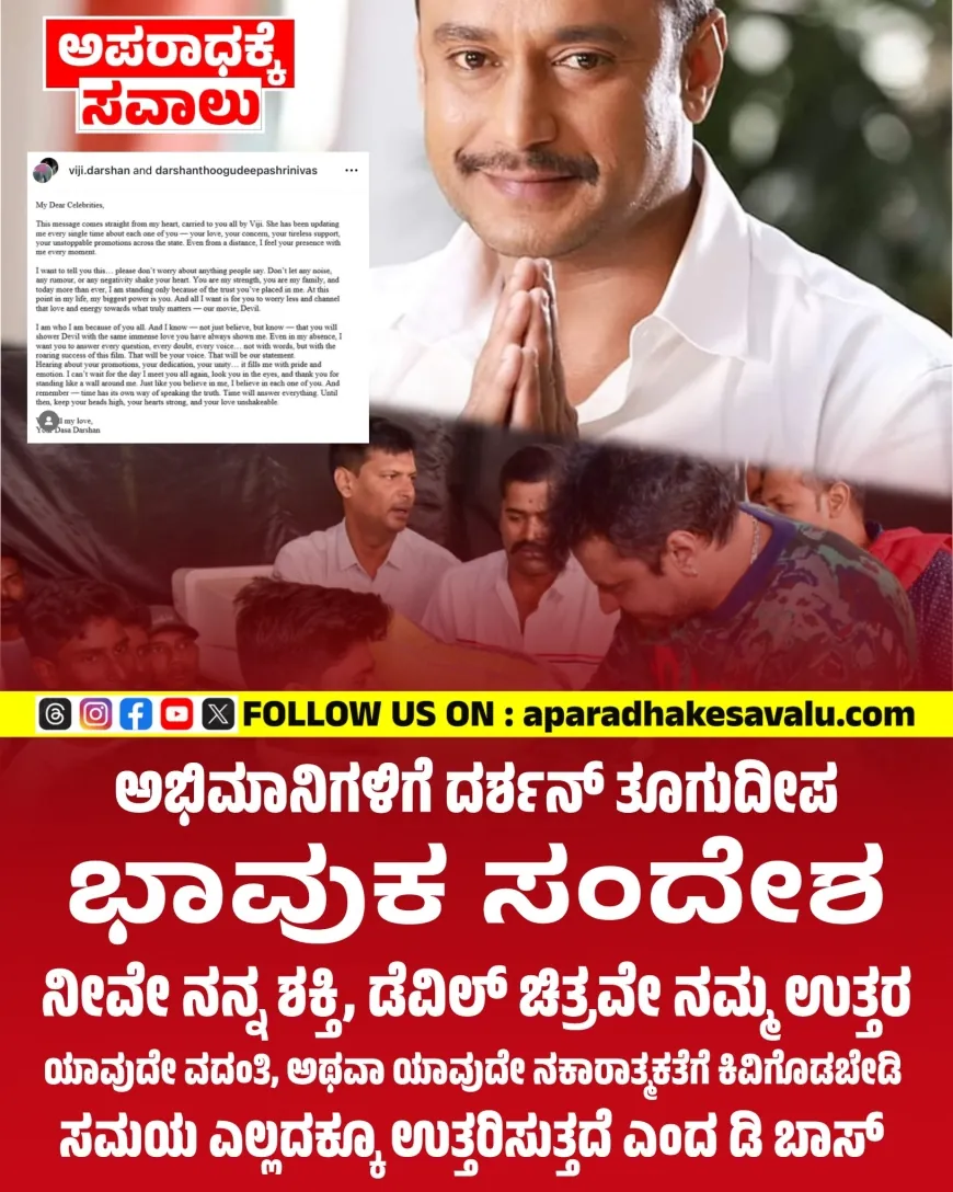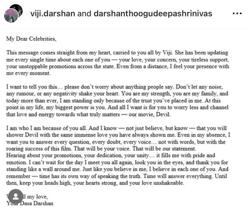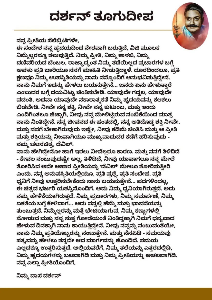 ಈ ಸಂದೇಶ ನನ್ನ ಹೃದಯದಿಂದ ನೇರವಾಗಿ ಬರುತ್ತಿದೆ, ವಿಜಿ ಮೂಲಕ ನಿಮ್ಮೆಲ್ಲರನ್ನೂ ತಲುಪುತ್ತಿದೆ. ನಿಮ್ಮ ಪ್ರೀತಿ, ನಿಮ್ಮ ಕಾಳಜಿ, ನಿಮ್ಮ ದಣಿವರಿಯದ ಬೆಂಬಲ, ರಾಜ್ಯಾದ್ಯಂತ ನಿಮ್ಮ ತಡೆಯಿಲ್ಲದ ಪ್ರಚಾರಗಳ ಬಗ್ಗೆ ಅವಳು ಪ್ರತಿ ಬಾರಿಯೂ ನನಗೆ ಮಾಹಿತಿ ನೀಡುತ್ತಿದ್ದಾಳೆ. ದೂರದಿಂದಲೂ, ಪ್ರತಿ ಕ್ಷಣವೂ ನಿಮ್ಮ ಉಪಸ್ಥಿತಿಯನ್ನು ನಾನು ನನ್ನೊಂದಿಗೆ ಅನುಭವಿಸುತ್ತಿದ್ದೇನೆ. ನಾನು ನಿಮಗೆ ಇದನ್ನು ಹೇಳಲು ಬಯಸುತ್ತೇನೆ... ಜನರು ಏನು ಹೇಳುತ್ತಾರೆ ಎಂಬುದರ ಬಗ್ಗೆ ದಯವಿಟ್ಟು ಚಿಂತಿಸಬೇಡಿ. ಯಾವುದೇ ಗದ್ದಲ, ಯಾವುದೇ ವದಂತಿ, ಅಥವಾ ಯಾವುದೇ ನಕಾರಾತ್ಮಕತೆ ನಿಮ್ಮ ಹೃದಯವನ್ನು ಕಲಕಲು ಬಿಡಬೇಡಿ. ನೀವೇ ನನ್ನ ಶಕ್ತಿ, ನೀವೇ ನನ್ನ ಕುಟುಂಬ, ಮತ್ತು ಇಂದು ಎಂದಿಗಿಂತಲೂ ಹೆಚ್ಚಾಗಿ, ನೀವು ನನ್ನ ಮೇಲಿಟ್ಟಿರುವ ನಂಬಿಕೆಯಿಂದ ಮಾತ್ರ ನಾನು ನಿಂತಿದ್ದೇನೆ. ನನ್ನ ಜೀವನದ ಈ ಹಂತದಲ್ಲಿ, ನನ್ನ ಅತಿದೊಡ್ಡ ಶಕ್ತಿ ನೀವೇ. ಮತ್ತು ನನಗೆ ಬೇಕಾಗಿರುವುದು ಇಷ್ಟೇ, ನೀವು ಕಡಿಮೆ ಚಿಂತಿಸಿ ಮತ್ತು ಆ ಪ್ರೀತಿ ಮತ್ತು ಶಕ್ತಿಯನ್ನು ನಿಜವಾಗಿಯೂ ಮುಖ್ಯವಾದುದರ ಕಡೆಗೆ ಹರಿಸುವುದು - ನಮ್ಮ ಚಲನಚಿತ್ರ, ಡೆವಿಲ್.