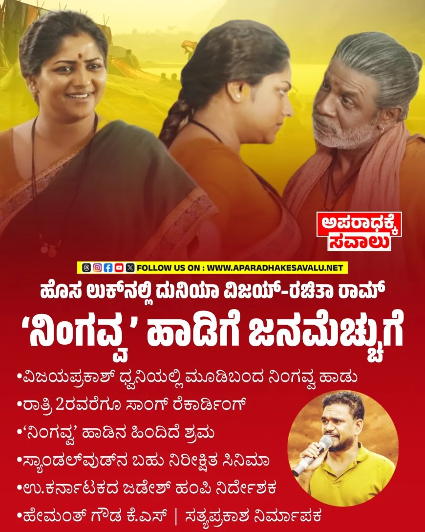 ಸ್ಯಾಂಡಲ್ವುಡ್ನ ಬಹು ನಿರೀಕ್ಷಿತ ಸಿನಿಮಾ ಲ್ಯಾಂಡ್ಲಾರ್ಡ್ ಚಿತ್ರದ ಮೊದಲ ವಿಡಿಯೋ ಸಾಂಗ್ ‘ನಿಂಗವ್ವ ನಿಂಗವ್ವ’ ಬಿಡುಗಡೆಯಾಗಿದೆ. 80ರ ದಶಕದ ಹಳ್ಳಿ ಸೊಗಡನ್ನು ಪ್ರತಿಬಿಂಬಿಸುವ ಈ ಹಾಡಿನಲ್ಲಿ ದುನಿಯಾ ವಿಜಯ್ ಹಾಗೂ ರಚಿತಾ ರಾಮ್ ಹೊಸ ಲುಕ್ನಲ್ಲಿ ಕಾಣಿಸಿಕೊಂಡಿದ್ದು, ಅವರ ಜೋಡಿ ಮತ್ತು ಕೆಮಿಸ್ಟ್ರಿ ಸಿನಿಪ್ರೇಕ್ಷಕರ ಗಮನ ಸೆಳೆಯುತ್ತಿದೆ. ವಿಜಯ್ ಪ್ರಕಾಶ್ ಅವರ ಧ್ವನಿಗೆ ಅಜನೀಶ್ ಲೋಕನಾಥ್ ಸಂಗೀತ ಸಂಯೋಜನೆಯೊಂದಿಗೆ ಹಾಡು ಮನಮುಟ್ಟುವಂತೆ ಮೂಡಿಬಂದಿದೆ.